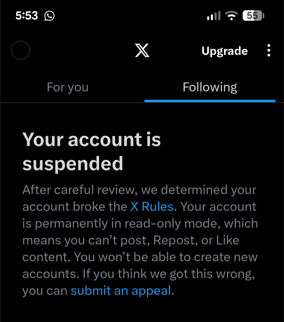 I lost three (of five) X accounts today. I’ve seen a lot of accounts going down or being diminished across the platform, some of whom are vital voices in both our hierarchical movement as well as free speech.